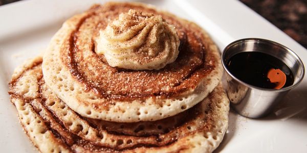 cinnamon sugar swirled pancakes, sweet cream cheese icing, maple syrup