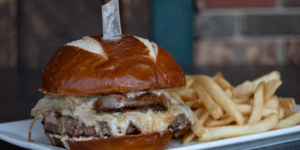 grilled burger blend, swiss cheese, sauerkraut, beer-poached bratwurst, stout aioli, toasted pretzel bun