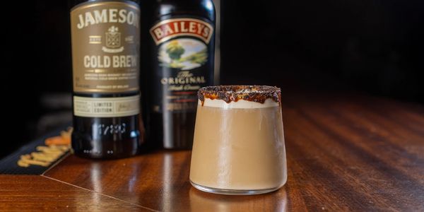 jameson cold brew whiskey, brown sugar syrup, cold brew coffee, baileys infused whipped cream, crushed oreo rim, oreo crumble topping