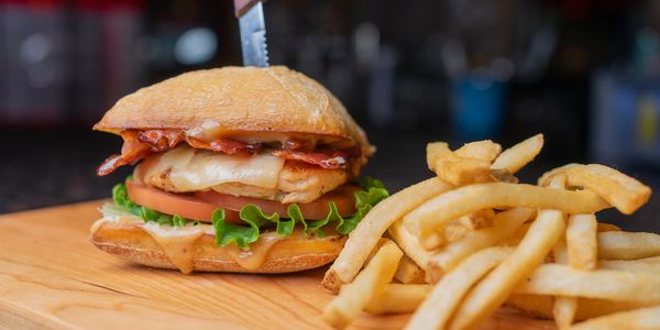 grilled chicken, pepper jack cheese, bacon, lettuce, tomato, red onion, spicy bacon honey sauce, toasted ciabatta bread